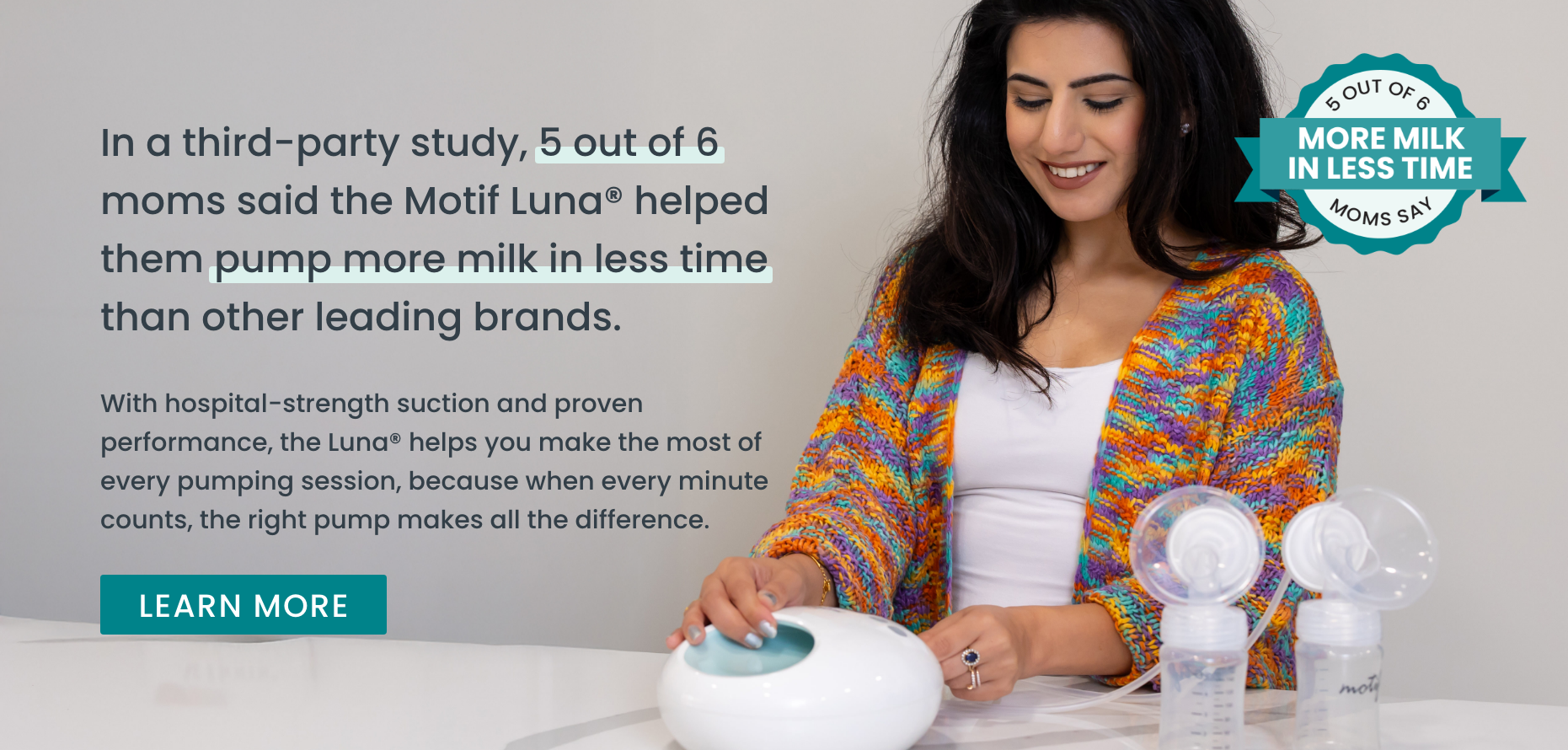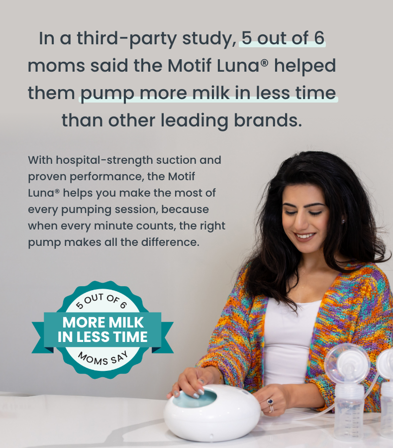 Sophisticated. Strong. Soothing. Meet the Luna. The powerful new breast pump from Motif Medical. Sleek on the outside and high-powered on the inside, moms say the Luna pumps "more milk in less time" and is easy to use, with a quiet motor that wonāt wake baby.